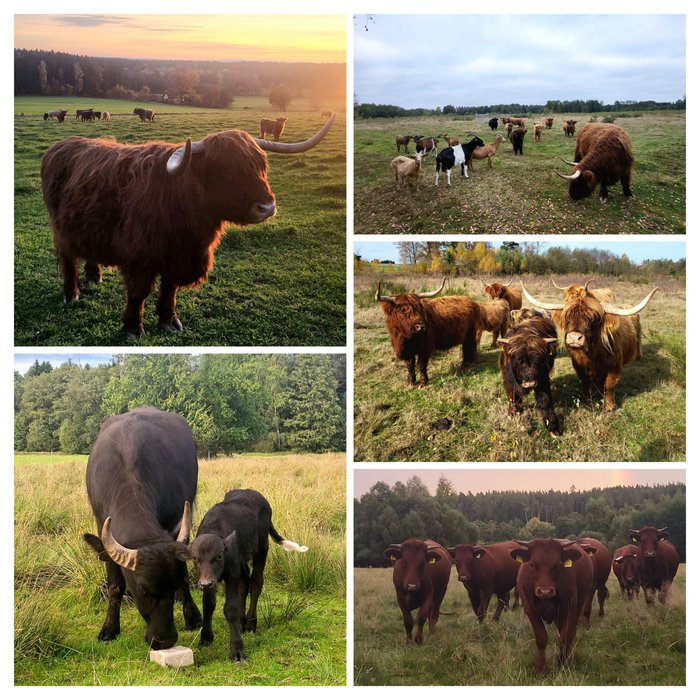 Ein weiterer Schwerpunkt der Wolfs ist die Mutterkuhhaltung. Seit 2018 wurde der Betrieb von Fleckvieh auf robuste Extensivrassen umgestellt. Heute leben mehr als 100 Tiere – darunter Hochlandrinder, Rotes Höhenvieh, Wasserbüffel und Ziegen – auf den Flächen der Familie. Insgesamt beweiden sie über 100 Hektar Grünland in den Landkreisen Tirschenreuth, Bayreuth und Wunsiedel. Weitere 42 Hektar werden per Hand mit dem Balkenmäher gepflegt, um besonders empfindliche Lebensräume zu schützen.