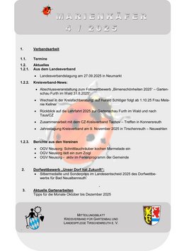 Hier können sie das Mitteilungsblatt "Marienkäfer" des Kreisverbandes für Gartenbau Tirschenreuth für das 4. Quartal 2025 herunterladen.